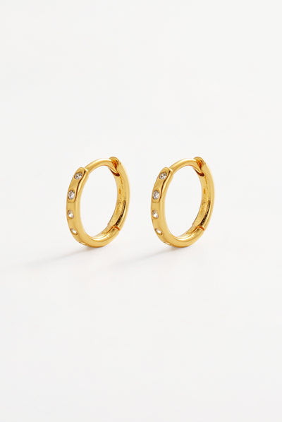 The Talia Huggie is a refined everyday hoop featuring delicate crystal accents set into a sleek gold silhouette. Designed to sit close to the ear, this piece delivers subtle sparkle while maintaining a clean, minimal finish.