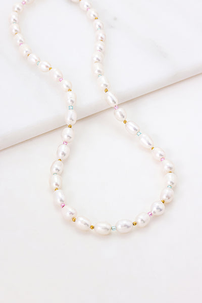 The Aria Pearl Necklace is a fresh take on classic pearls, blending timeless elegance with a playful twist. Featuring lustrous freshwater pearls interspersed with pastel-toned beads and delicate gold accents, this piece brings a subtle pop of colour to your everyday look. Perfect for layering or wearing solo, Aria captures a balance of sophistication and modern charm.