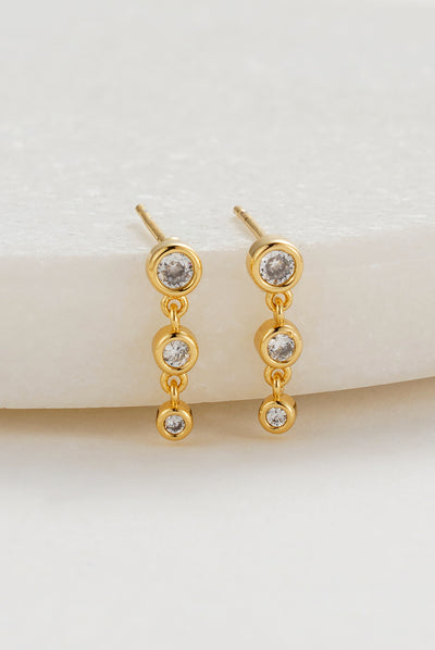 The Abby Earring features a cascading trio of bezel-set crystals that shimmer with every move. Crafted in polished gold, this elegant drop design offers a little extra drama while remaining timeless and versatile. Wear them solo for statement sparkle or pair back with our Amy Stud for a perfectly coordinated look.