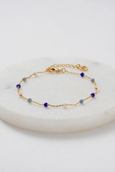 Designed to pair beautifully with the Charlotte Earrings and Necklace, the Charlotte Bracelet balances simplicity with a touch of colour. Blue enamel beads are spaced along a dainty gold chain. A versatile piece that brings subtle charm to any stack.