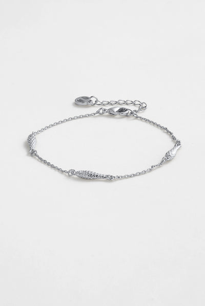 A delicate chain bracelet featuring three textured fish charms for a playful coastal touch. Perfect for everyday wear and beautifully paired with the matching Tate Necklace and Huggies.