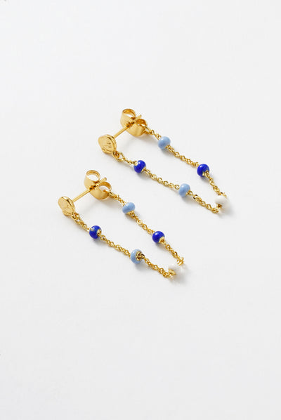 Playful yet refined, the Charlotte Earrings feature a delicate gold chain adorned with soft blue enamel beads and a single pearl accent. Their fluid drop design adds movement and colour to your look — perfect for elevating everyday outfits or adding a subtle statement to evening wear.