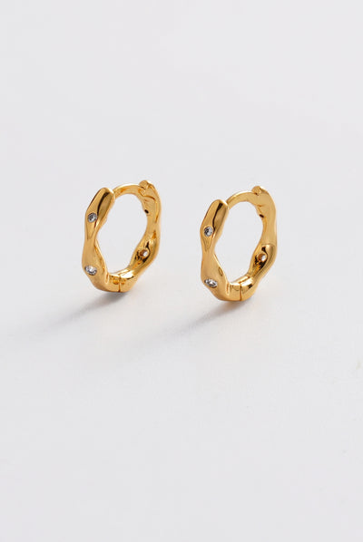 The June Huggie features a softly sculpted organic silhouette with delicate crystal accents set into a polished gold finish. Its fluid shape adds subtle texture and dimension, giving this everyday huggie a modern and distinctive edge.