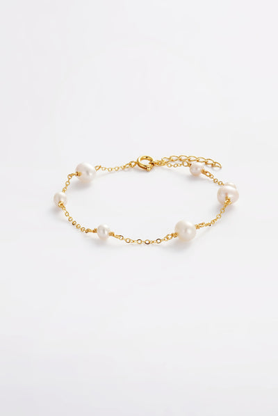 The Luna Pearl Bracelet is a refined everyday piece that blends delicate gold chain with luminous freshwater pearls. Each pearl is spaced along the chain to create an effortless, modern silhouette that feels both timeless and easy to style.
