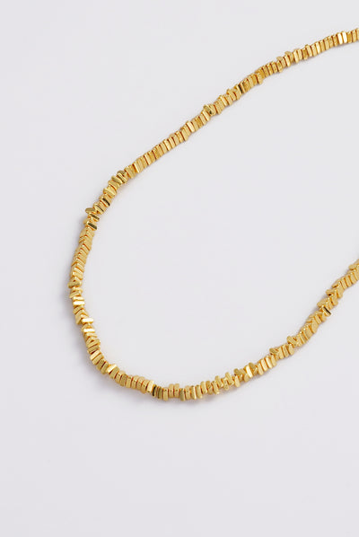The Remi Necklace features a delicate strand of polished gold beads, creating a textured yet minimal design that catches the light beautifully. Its refined silhouette adds subtle shine while remaining versatile enough for everyday styling.
